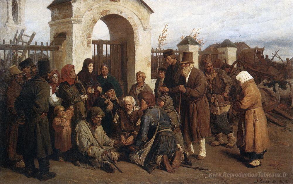 Nous vous proposons une reproduction artisanale sur toile du célèbre tableau 'Chanteuse de mendiants (pèlerins)' de Viktor Vasnetsov, provenant du Musée de la Reproduction.