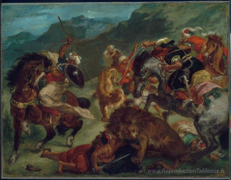 Nous vous proposons une reproduction artisanale sur toile du célèbre tableau 'Chasse au lion' de Eugene Delacroix, provenant du Musée de la Reproduction.