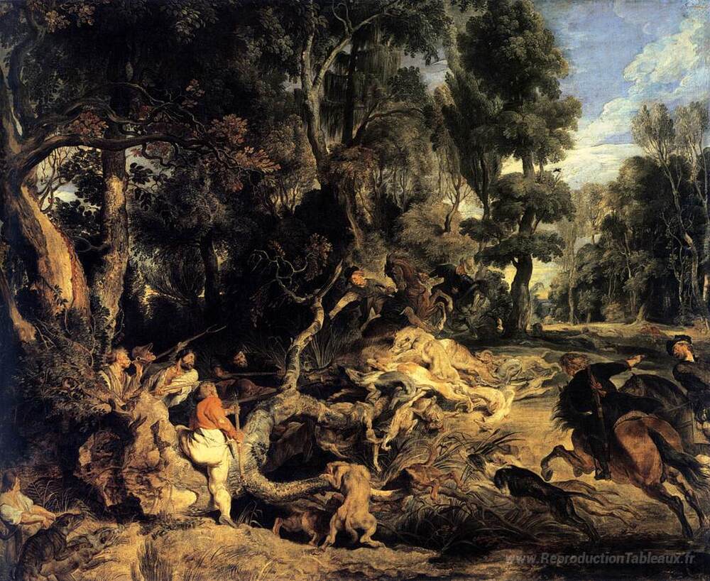 Nous vous proposons une reproduction artisanale sur toile du célèbre tableau 'Chasse au sanglier' de Peter Paul Rubens, provenant du Musée de la Reproduction.