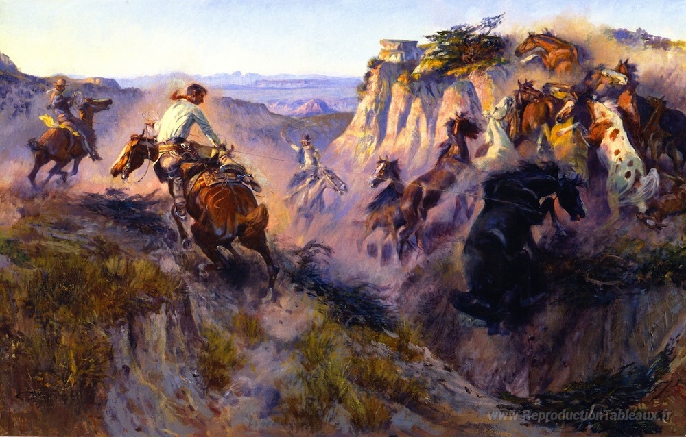 Nous vous proposons une reproduction artisanale sur toile du célèbre tableau 'Chasseurs de chevaux sauvages [Non. 2]' de Charles M. Russell, provenant du Musée de la Reproduction.
