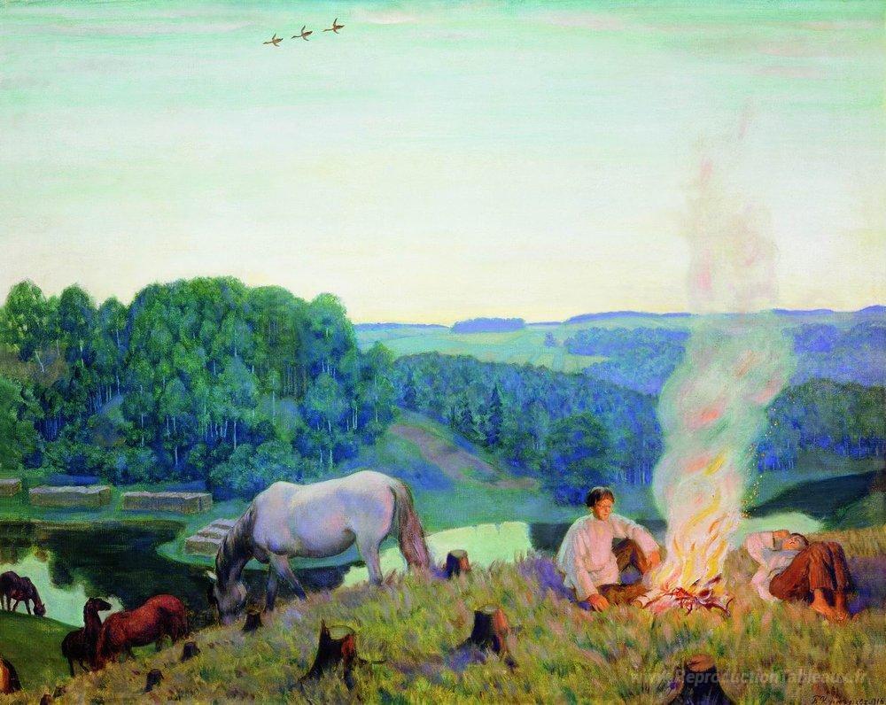 Nous vous proposons une reproduction artisanale sur toile du célèbre tableau 'Cheminée (nuit)' de Boris Kustodiev, provenant du Musée de la Reproduction.