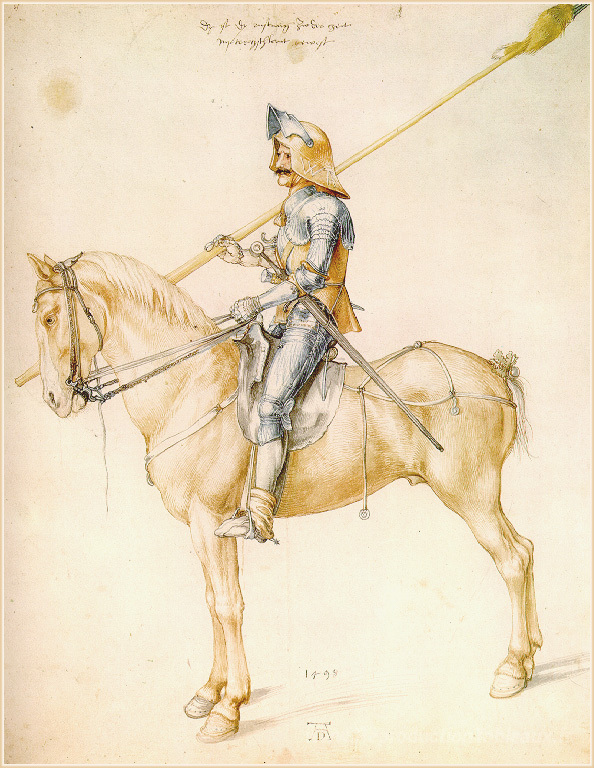Nous vous proposons une reproduction artisanale sur toile du célèbre tableau 'Chevalier à cheval' de Albrecht Durer, provenant du Musée de la Reproduction.