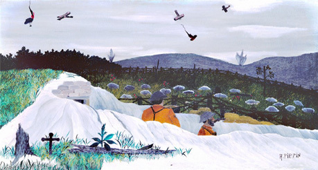 Nous vous proposons une reproduction artisanale sur toile du célèbre tableau 'CHIEN BROWS pour les tranchées' de Horace Pippin, provenant du Musée de la Reproduction.