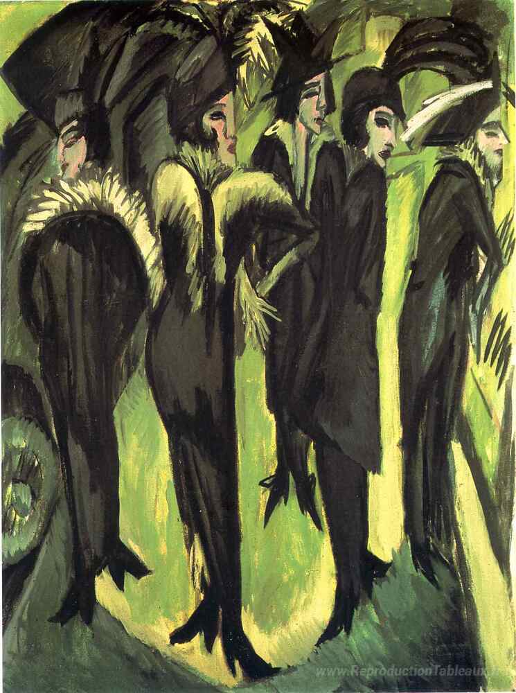 Nous vous proposons une reproduction artisanale sur toile du célèbre tableau 'Cinq femmes dans la rue' de Ernst Ludwig Kirchner, provenant du Musée de la Reproduction.