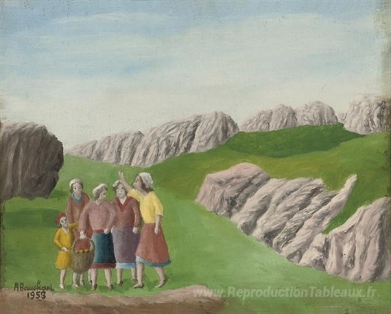 Nous vous proposons une reproduction artisanale sur toile du célèbre tableau 'Cinq personnages dans un paysage de montagne' de Andre Bauchant, provenant du Musée de la Reproduction.
