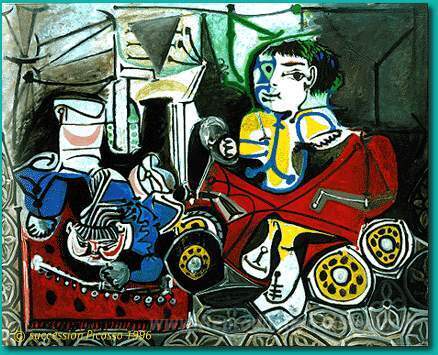 Nous vous proposons une reproduction artisanale sur toile du célèbre tableau 'Claude et Paloma jouant' de Pablo Picasso, provenant du Musée de la Reproduction.