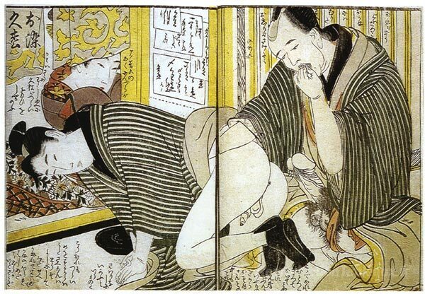 Nous vous proposons une reproduction artisanale sur toile du célèbre tableau 'Client lubrifiant une prostituée' de Kitagawa Utamaro, provenant du Musée de la Reproduction.