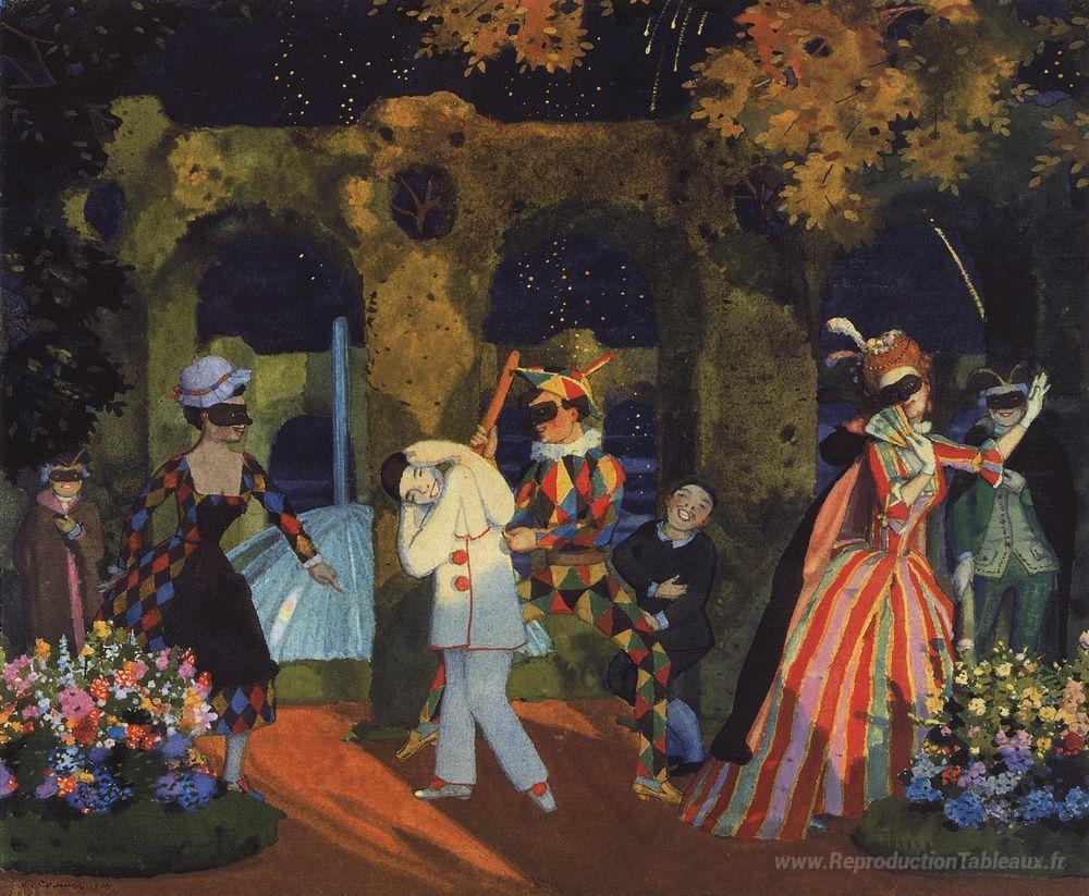 Nous vous proposons une reproduction artisanale sur toile du célèbre tableau 'Comédie italienne 1' de Konstantin Somov, provenant du Musée de la Reproduction.