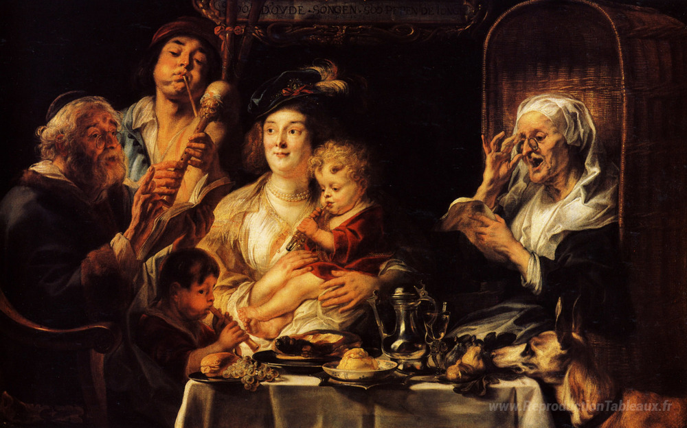 Nous vous proposons une reproduction artisanale sur toile du célèbre tableau 'Comme le vieux chantait, donc la jeune pipe' de Jacob Jordaens, provenant du Musée de la Reproduction.