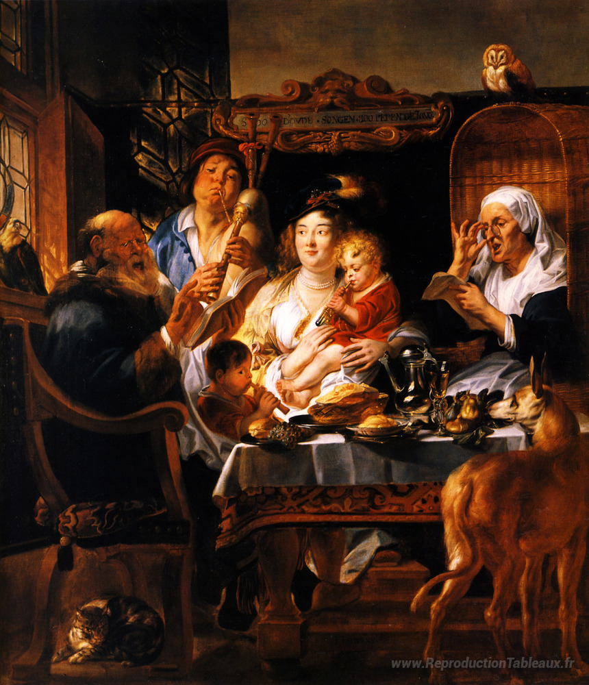 Nous vous proposons une reproduction artisanale sur toile du célèbre tableau 'Comme le vieux chantait, donc la jeune pipe' de Jacob Jordaens, provenant du Musée de la Reproduction.