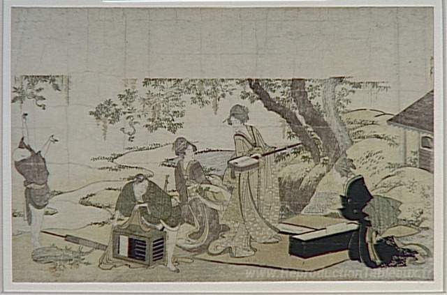 Nous vous proposons une reproduction artisanale sur toile du célèbre tableau 'Concert sous les glycines' de Katsushika Hokusai, provenant du Musée de la Reproduction.