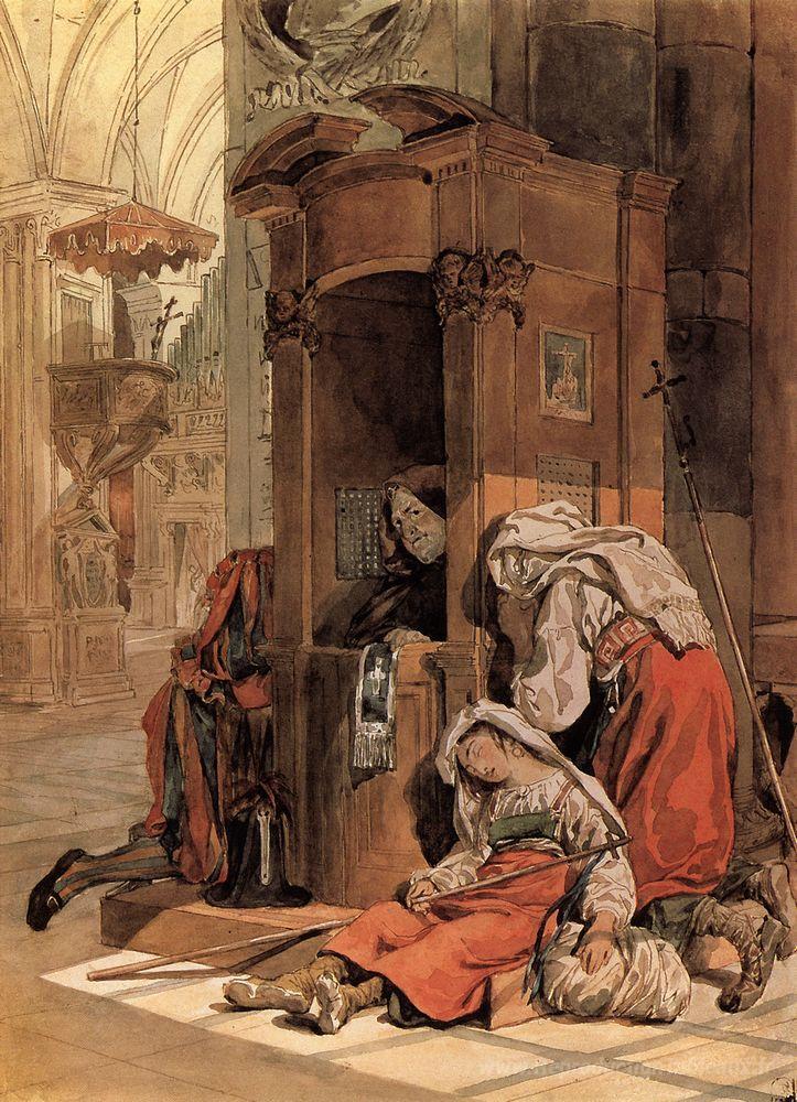 Nous vous proposons une reproduction artisanale sur toile du célèbre tableau 'Confession d'une femme italienne' de Karl Bryullov, provenant du Musée de la Reproduction.