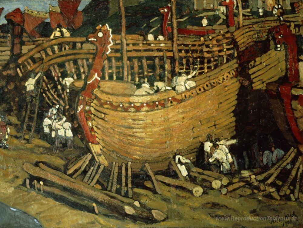 Nous vous proposons une reproduction artisanale sur toile du célèbre tableau 'Construire les navires' de Nicholas Roerich, provenant du Musée de la Reproduction.