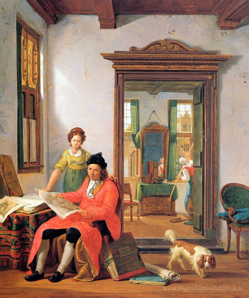 Nous vous proposons une reproduction artisanale sur toile du célèbre tableau 'Contemplation d'un dessin' de Abraham van Strij, provenant du Musée de la Reproduction.