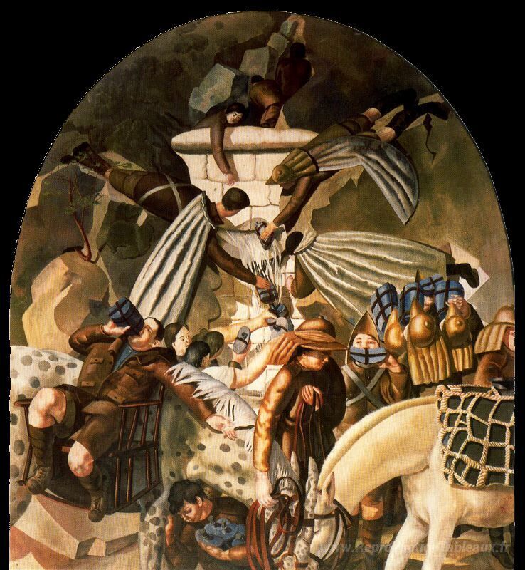 Nous vous proposons une reproduction artisanale sur toile du célèbre tableau 'Convoi des hommes blessés remplissant des bouteilles d'eau dans ' de Stanley Spencer, provenant du Musée de la Reproduction.