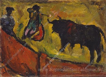 Nous vous proposons une reproduction artisanale sur toile du célèbre tableau 'Corrida. Étude.' de Pyotr Konchalovsky, provenant du Musée de la Reproduction.