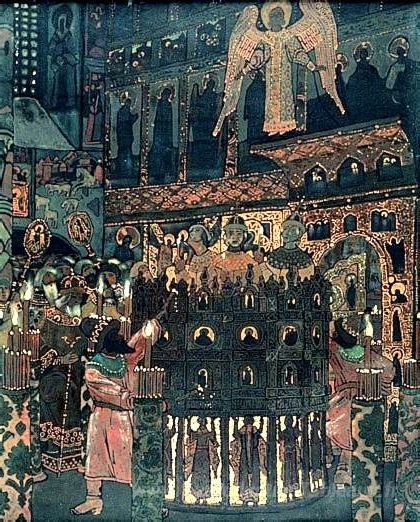 Nous vous proposons une reproduction artisanale sur toile du célèbre tableau 'Costume Devotion of Fiery Furnace avant la liturgie de Noël dans' de Nicholas Roerich, provenant du Musée de la Reproduction.