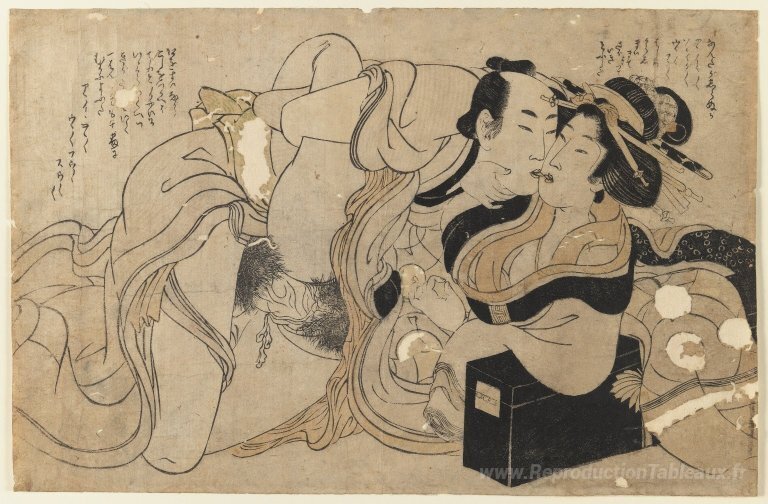 Nous vous proposons une reproduction artisanale sur toile du célèbre tableau 'Couple amoureux' de Kitagawa Utamaro, provenant du Musée de la Reproduction.