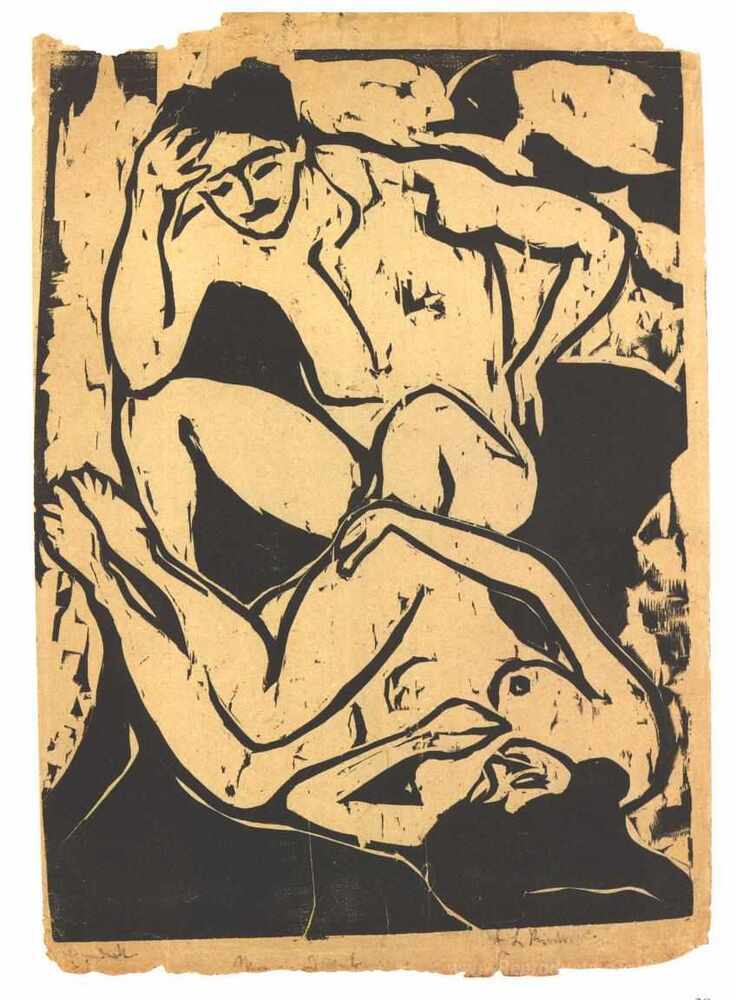 Nous vous proposons une reproduction artisanale sur toile du célèbre tableau 'Couple nacké sur un canapé' de Ernst Ludwig Kirchner, provenant du Musée de la Reproduction.