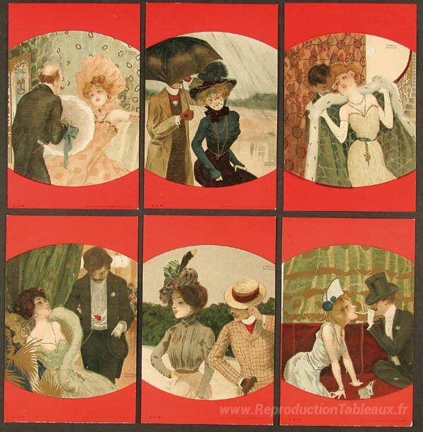 Nous vous proposons une reproduction artisanale sur toile du célèbre tableau 'Couples entre les bordures rouges' de Raphael Kirchner, provenant du Musée de la Reproduction.