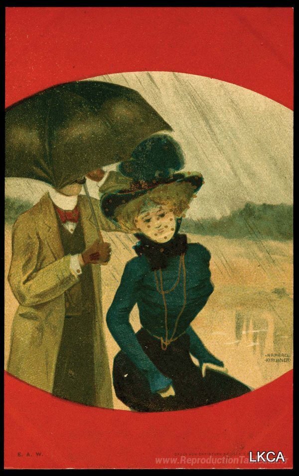 Nous vous proposons une reproduction artisanale sur toile du célèbre tableau 'Couples entre les bordures rouges' de Raphael Kirchner, provenant du Musée de la Reproduction.