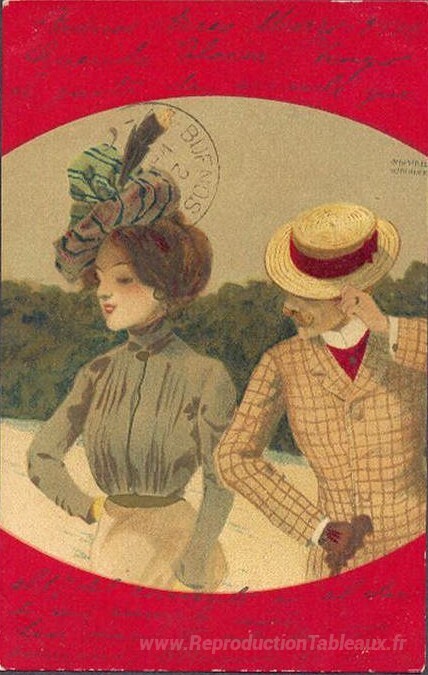 Nous vous proposons une reproduction artisanale sur toile du célèbre tableau 'Couples entre les bordures rouges' de Raphael Kirchner, provenant du Musée de la Reproduction.
