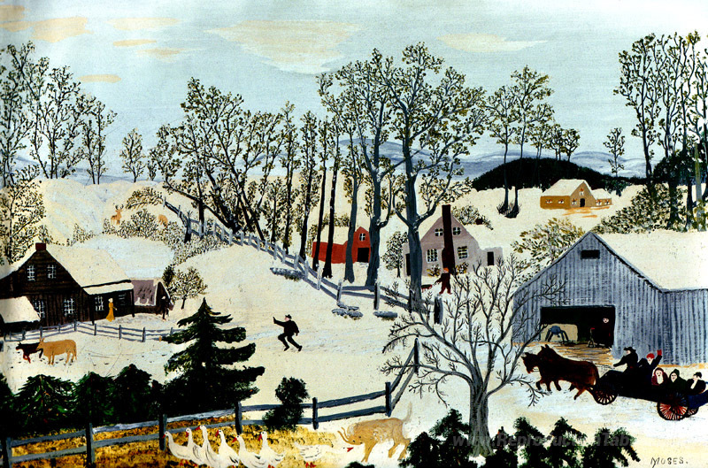 Nous vous proposons une reproduction artisanale sur toile du célèbre tableau 'Début du printemps à la ferme' de Grandma Moses, provenant du Musée de la Reproduction.