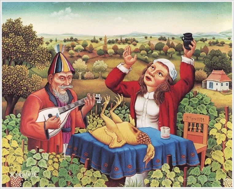 Nous vous proposons une reproduction artisanale sur toile du célèbre tableau 'Déjeuner à vignoble' de Ivan Generalic, provenant du Musée de la Reproduction.