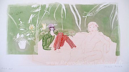 Nous vous proposons une reproduction artisanale sur toile du célèbre tableau 'Départ du portefeuille «Invitation to a Voyage» de 5 aquatints' de Patrick Procktor, provenant du Musée de la Reproduction.