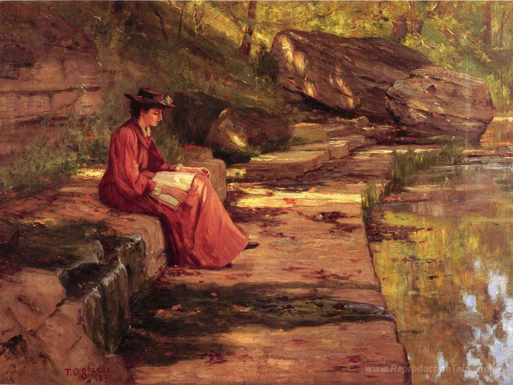 Nous vous proposons une reproduction artisanale sur toile du célèbre tableau 'Daisy au bord de la rivière' de T. C. Steele, provenant du Musée de la Reproduction.