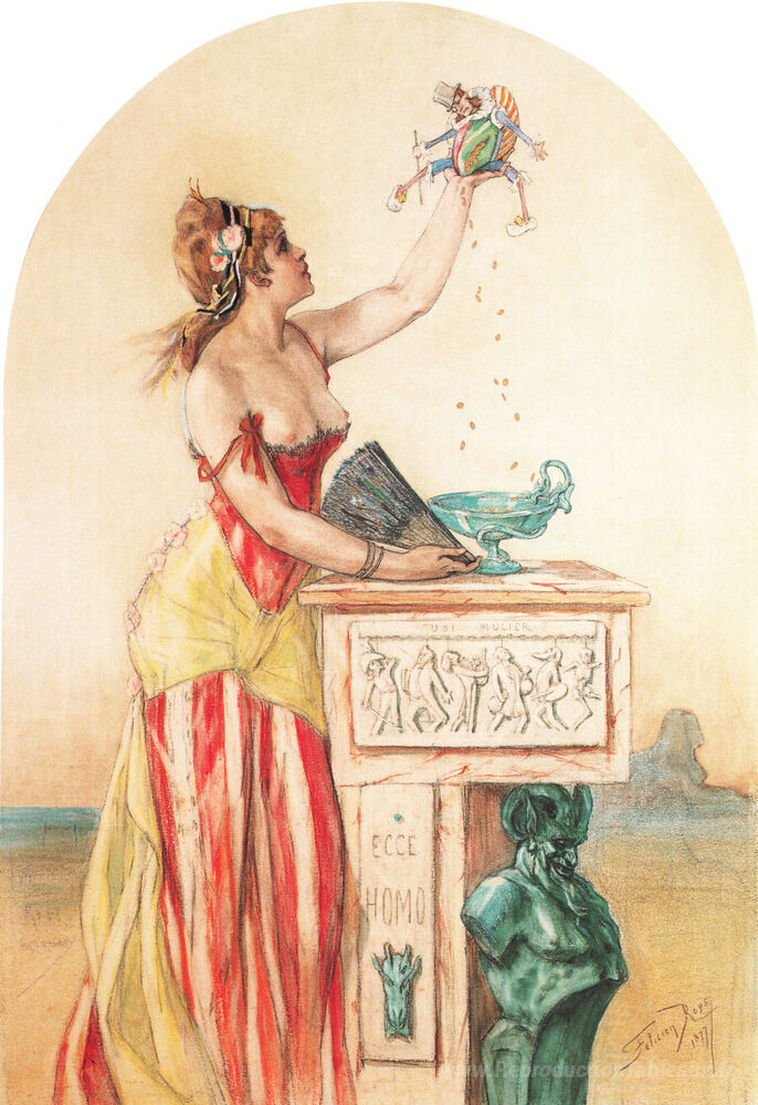 Nous vous proposons une reproduction artisanale sur toile du célèbre tableau 'Dame avec marionnette' de Felicien Rops, provenant du Musée de la Reproduction.