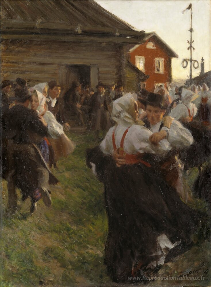 Nous vous proposons une reproduction artisanale sur toile du célèbre tableau 'Dance du milieu de l'été' de Anders Zorn, provenant du Musée de la Reproduction.