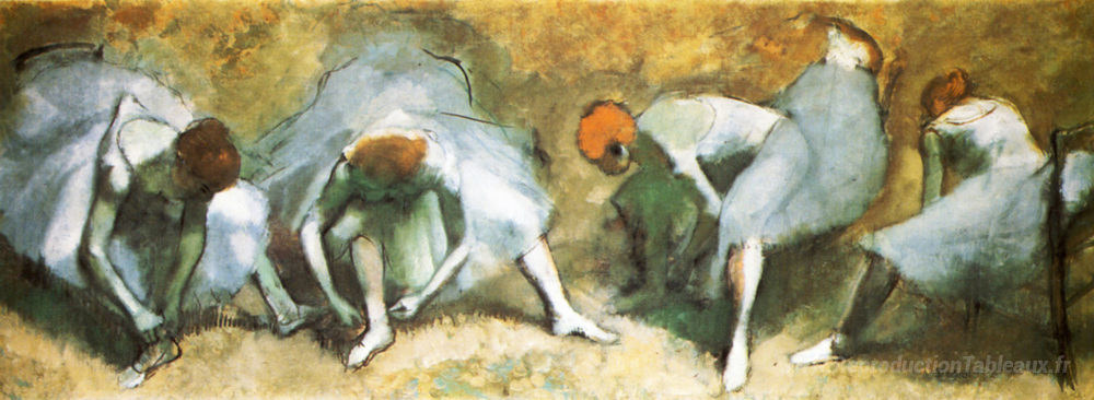 Nous vous proposons une reproduction artisanale sur toile du célèbre tableau 'Dancers liant des chaussures' de Edgar Degas, provenant du Musée de la Reproduction.