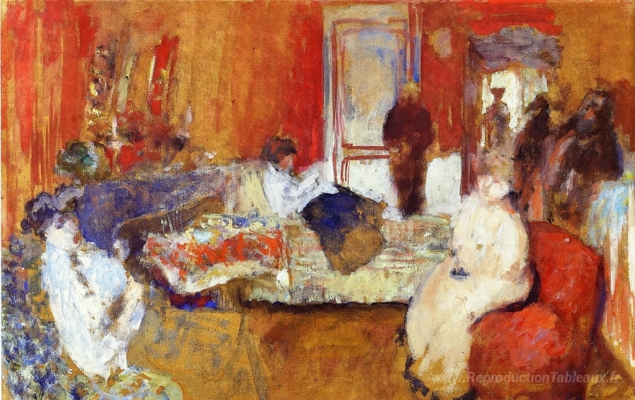 Nous vous proposons une reproduction artisanale sur toile du célèbre tableau 'Dans la salle rouge' de Edouard Vuillard, provenant du Musée de la Reproduction.