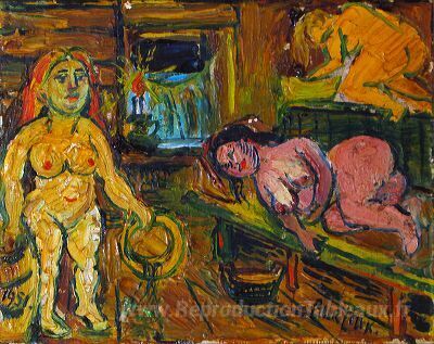 Nous vous proposons une reproduction artisanale sur toile du célèbre tableau 'Dans le bain de bain' de David Burliuk, provenant du Musée de la Reproduction.