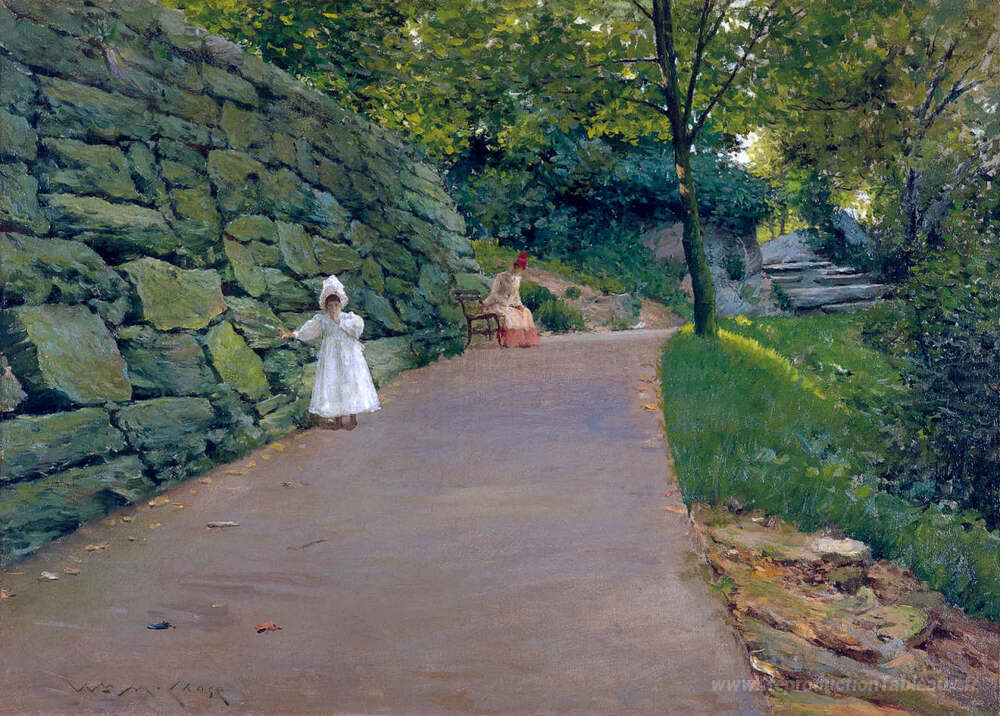 Nous vous proposons une reproduction artisanale sur toile du célèbre tableau 'Dans le parc - un chemin' de William Merritt Chase, provenant du Musée de la Reproduction.