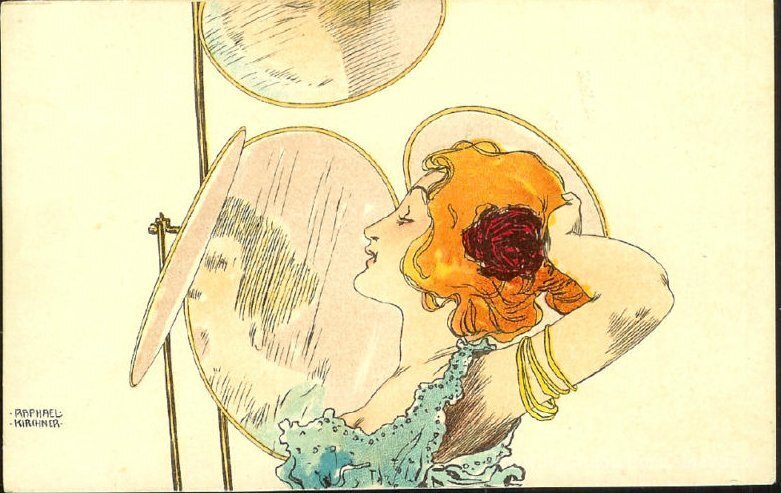 Nous vous proposons une reproduction artisanale sur toile du célèbre tableau 'Dans les coulisses' de Raphael Kirchner, provenant du Musée de la Reproduction.