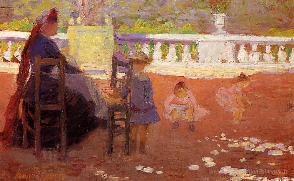 Nous vous proposons une reproduction artisanale sur toile du célèbre tableau 'Dans les jardins du Luxembourg' de Henri-Edmond Cross, provenant du Musée de la Reproduction.