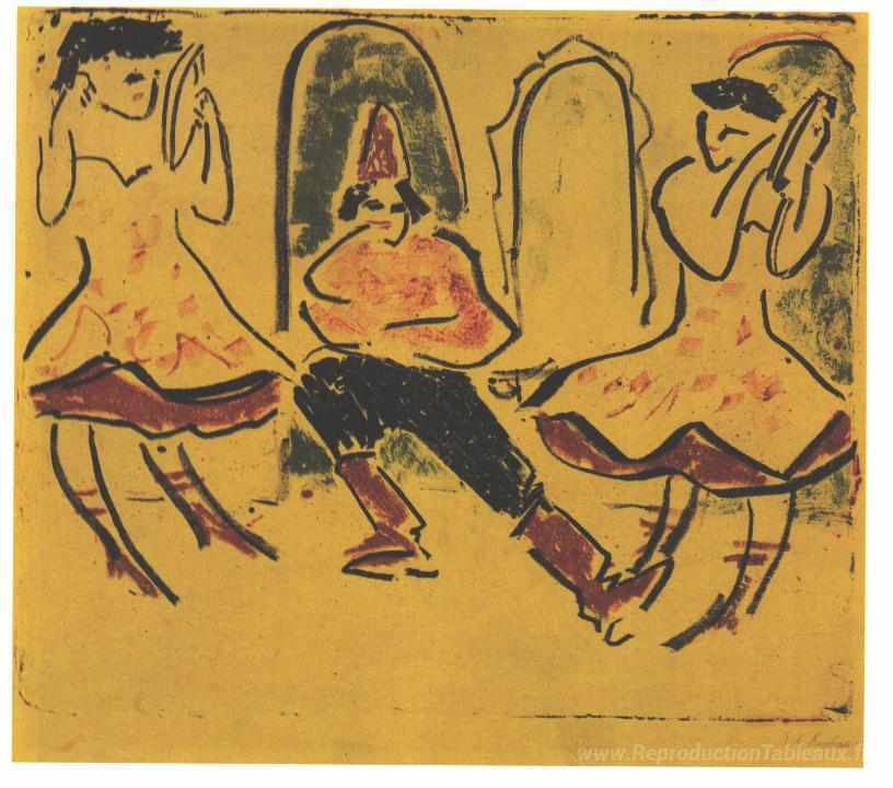 Nous vous proposons une reproduction artisanale sur toile du célèbre tableau 'Danse hongroise' de Ernst Ludwig Kirchner, provenant du Musée de la Reproduction.