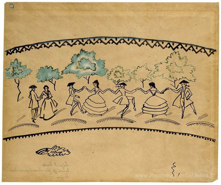 Nous vous proposons une reproduction artisanale sur toile du célèbre tableau 'Danse ronde' de August Macke, provenant du Musée de la Reproduction.