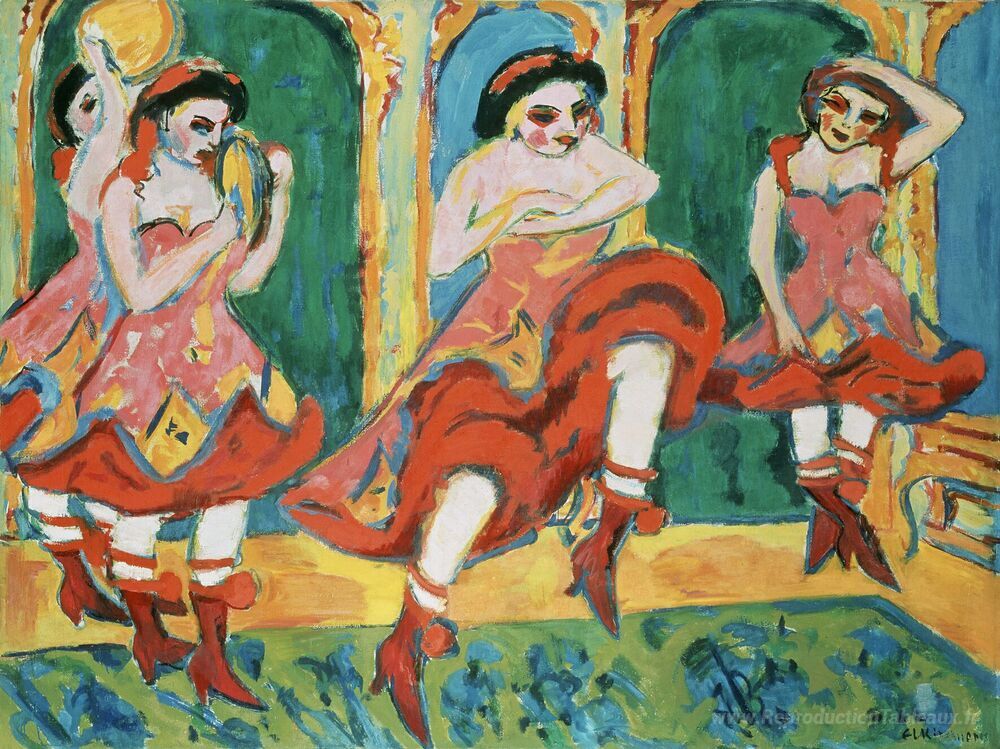 Nous vous proposons une reproduction artisanale sur toile du célèbre tableau 'Danseurs de tzard' de Ernst Ludwig Kirchner, provenant du Musée de la Reproduction.