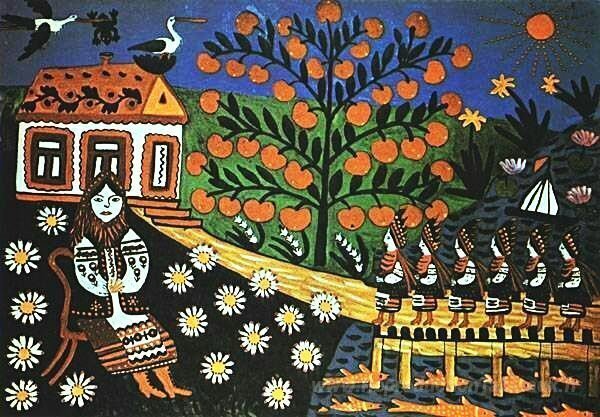 Nous vous proposons une reproduction artisanale sur toile du célèbre tableau 'Des années de ma jeunesse, viens me rendre visite' de Maria Primachenko, provenant du Musée de la Reproduction.
