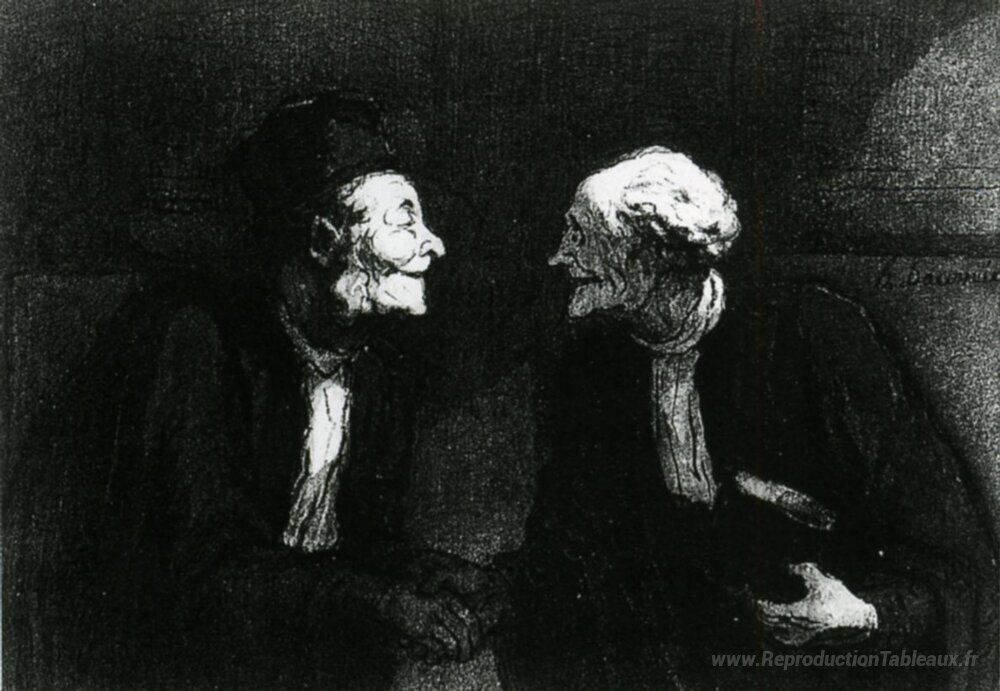 Nous vous proposons une reproduction artisanale sur toile du célèbre tableau 'Deux avocats la poignée de main' de Honore Daumier, provenant du Musée de la Reproduction.