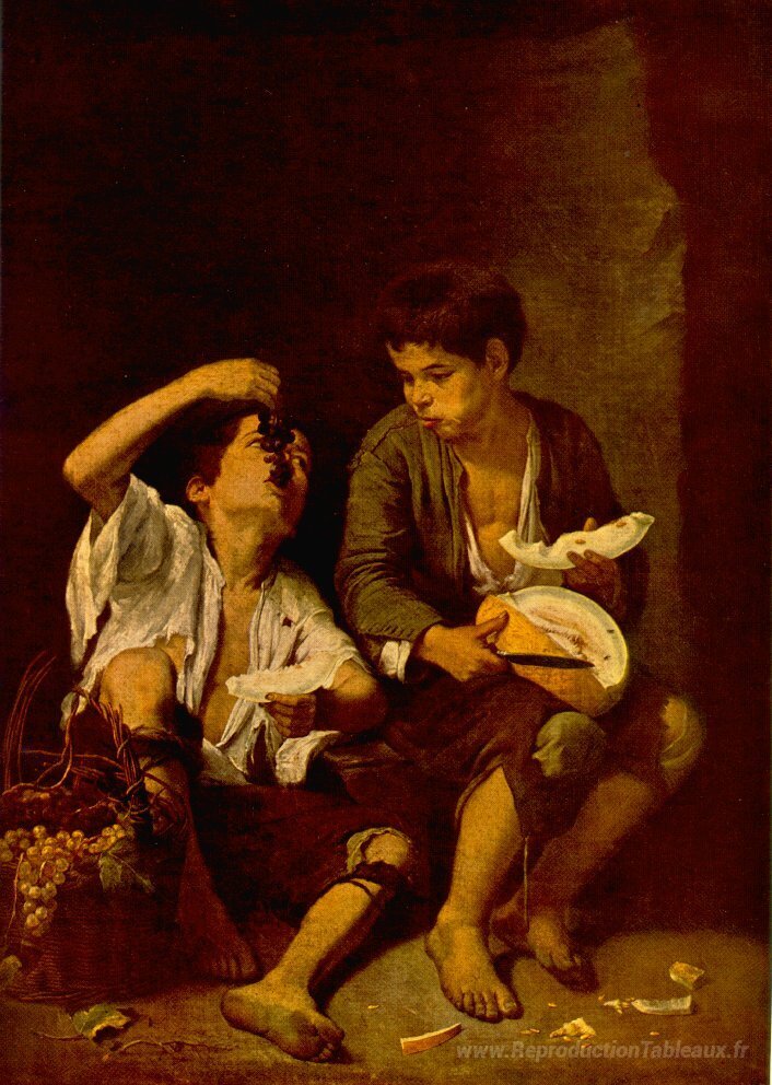 Nous vous proposons une reproduction artisanale sur toile du célèbre tableau 'Deux enfants mangeant un melon et des raisins' de Bartolome Esteban Murillo, provenant du Musée de la Reproduction.