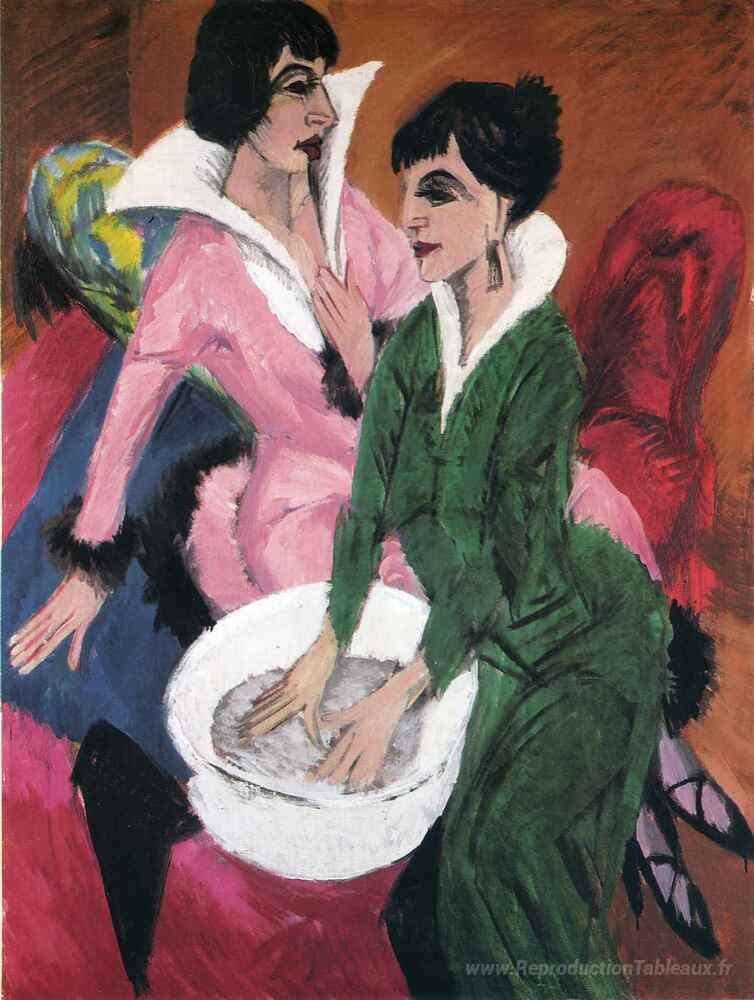 Nous vous proposons une reproduction artisanale sur toile du célèbre tableau 'Deux femmes avec un lavabo' de Ernst Ludwig Kirchner, provenant du Musée de la Reproduction.