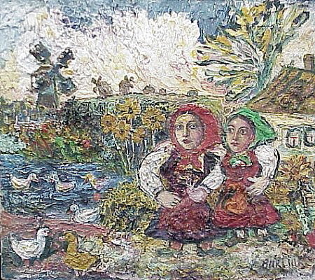 Nous vous proposons une reproduction artisanale sur toile du célèbre tableau 'Deux filles dans une cour de ferme avec des canards et un moulin' de David Burliuk, provenant du Musée de la Reproduction.
