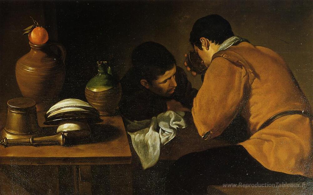 Nous vous proposons une reproduction artisanale sur toile du célèbre tableau 'Deux jeunes hommes mangeant à une humble table' de Diego Velazquez, provenant du Musée de la Reproduction.
