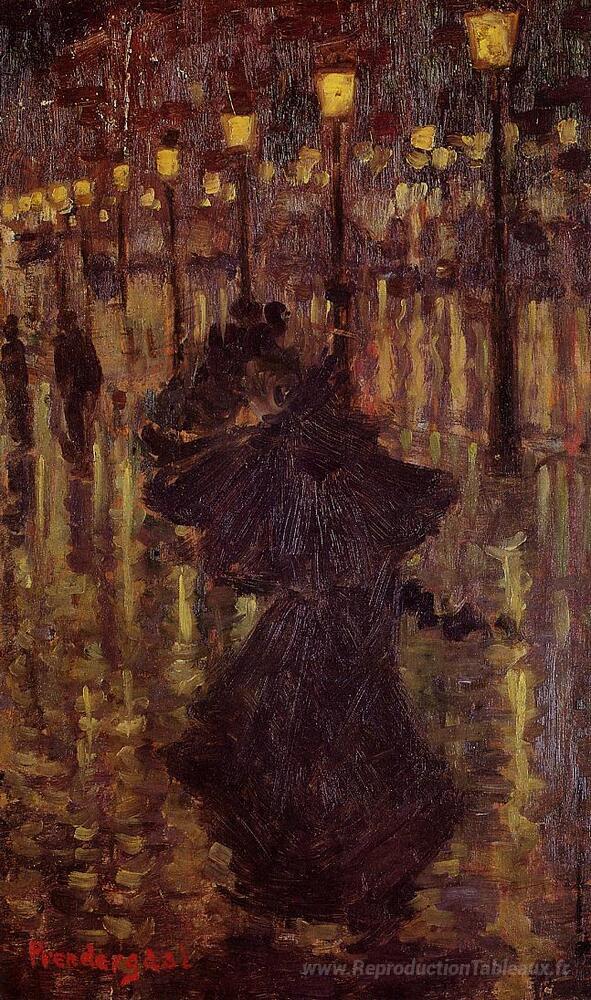 Nous vous proposons une reproduction artisanale sur toile du célèbre tableau 'Douche du soir, Paris' de Maurice Prendergast, provenant du Musée de la Reproduction.