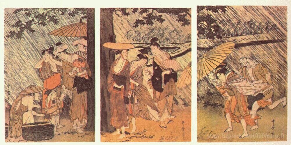 Nous vous proposons une reproduction artisanale sur toile du célèbre tableau 'Douche' de Kitagawa Utamaro, provenant du Musée de la Reproduction.