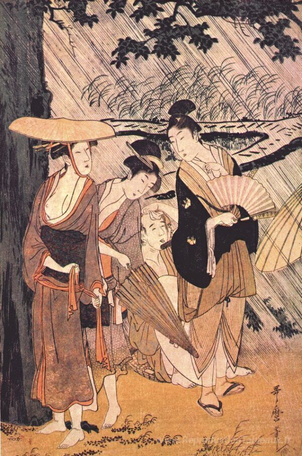 Nous vous proposons une reproduction artisanale sur toile du célèbre tableau 'Douche' de Kitagawa Utamaro, provenant du Musée de la Reproduction.